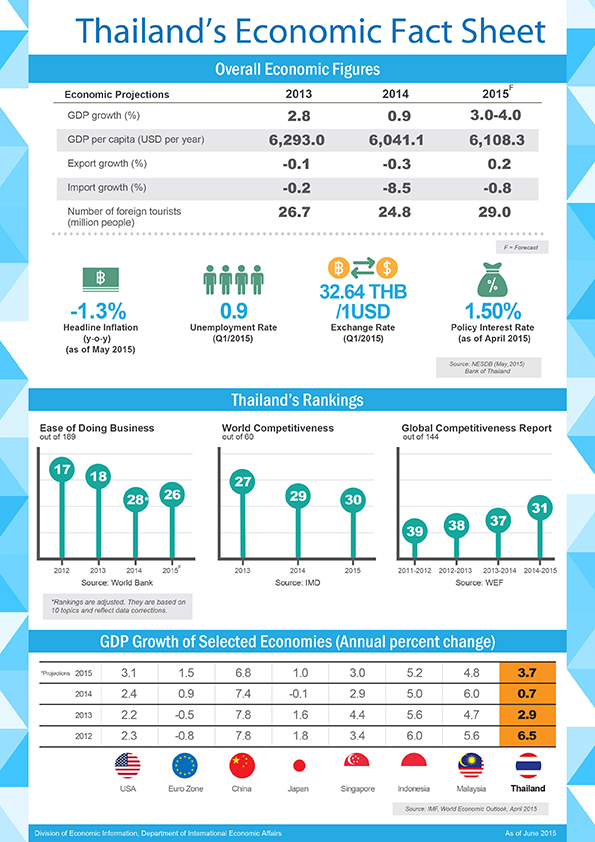 Thailand is Southeast Asia’s second largest economy with a gross domestic product (GDP) of around USD 300 billion. With a free-market economy, the Kingdom has a strong domestic market and a growing middle class, with the private sector being the main engine of growth. The Thai economy is well integrated into the global marketplace, with exports accounting for over 70 percent of the Kingdom’s GDP. Thailand also has a strong industrial sector (40 percent of GDP) and a robust and growing services sector (50 percent of GDP) centered on the tourism and financial services industries. Though traditionally an agrarian society and historically one of the world’s few net food exporters, the agricultural sector today accounts for approximately 9 percent of the country’s GDP. Given the importance of exports to Thailand, it has been a leader in the region in terms of trade liberalization and facilitation with the rest of the world, starting with its Asian neighbors. Thailand is a key player in the Association of Southeast Asian Nations (ASEAN), enjoying a strategic location that provides easy access to a larger market of nearly 600 million people, which is expected to gain even more strength when the ASEAN vision of One Community materializes in 2015, making it a community of connectivity, a single market and production base. Furthermore, Thailand’s convenient access to China and India, as well as to other East Asian countries such as Japan and the Republic of Korea, takes this huge consumer market to even bigger proportions. In addition, Thailand’s friendly relations and expanding networks of free trade agreements with other countries have further opened up trade access to markets both within and outside the region. These, coupled with the Kingdom’s strategic positioning, have made the country a regional center for international travel and trade, as well as a hub for various industries, of which the most notable are the automotive industry and agro-industries. With a favorable investment climate, an entrepreneurial spirit and an open society, Thailand has been chosen by many businesses, media firms, as well as international organizations and non-governmental organizations